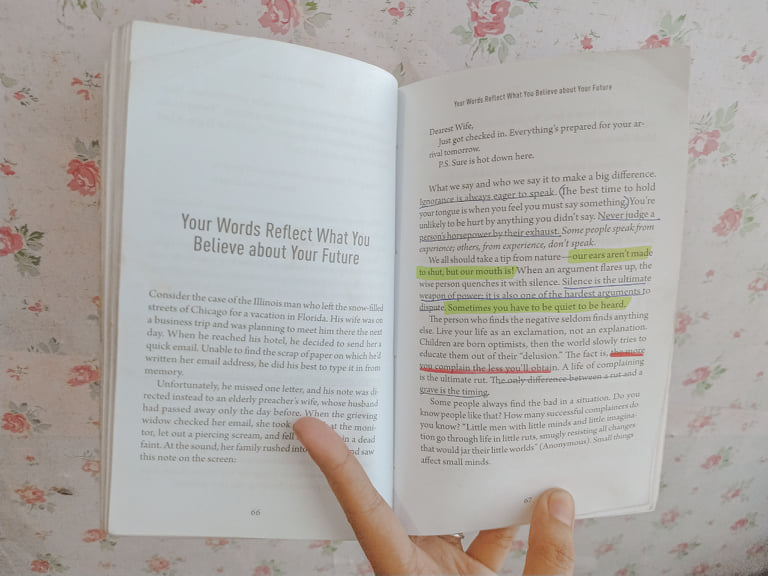 I closed the book for a moment and let the message sink in. I asked myself, honestly: What kind of words have I been speaking lately? Have they been encouraging—or have I unknowingly echoed doubt? That small reflection opened a door I didn’t expect. It reminded me that our inner dialogue doesn’t stay locked inside; it slips into conversations, reactions, and the way we carry ourselves.