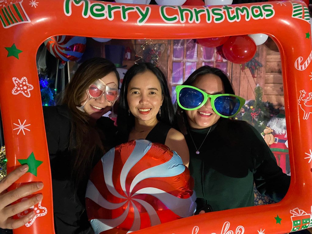 There was laughter echoing louder than the music, tables filled with lechon and dishes that tasted like home, and friends who turned an ordinary hall into a patch of belonging. We wore silly hats, oversized glasses, and Christmas jumpers—but beneath the costumes was something real: family found in the middle of foreign soil.