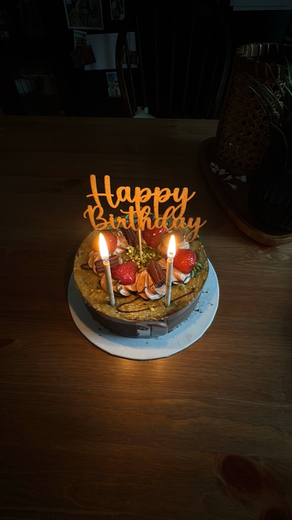 I sat with a chocolate cake in front of me, two candles flickering gently. The “Happy Birthday” topper stood proud among swirls of cream and strawberries—but I wasn’t in a rush to blow them out. I let the moment linger. Because birthdays, at this age, are not just about getting older—they’re about becoming softer, deeper, and more awake to life.