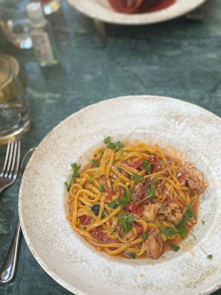 The food? A love language. Crisp golden calamari that whispered of the sea. Fresh pasta tangled with seafood and tomatoes, like a memory of home and travel all at once. A rich tomato-based prawn dish, heads on and unapologetically flavorful — the kind of plate that doesn’t ask for approval. It just is.