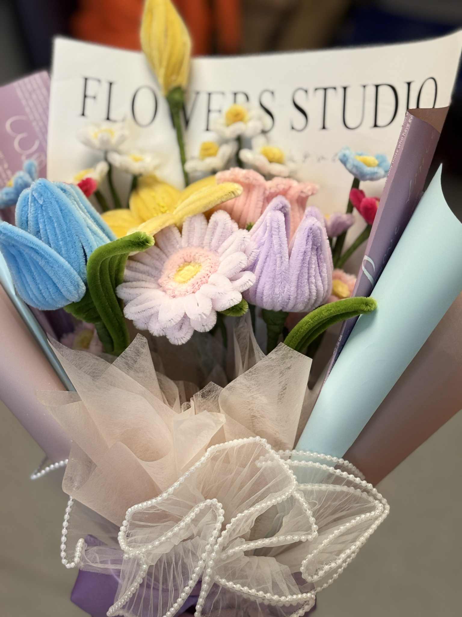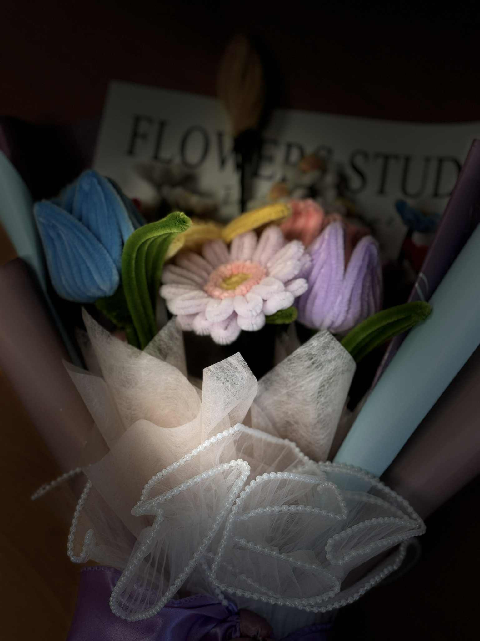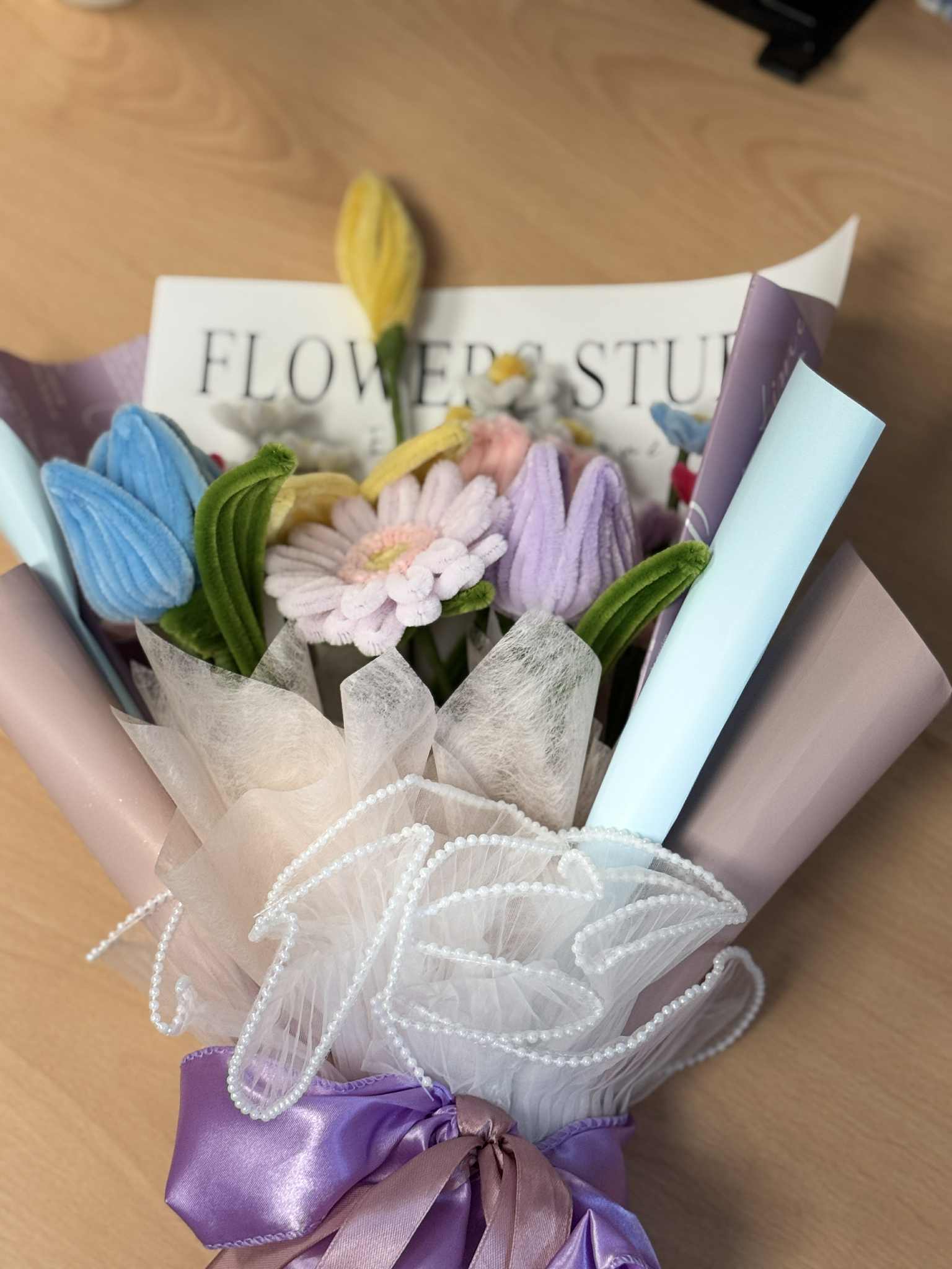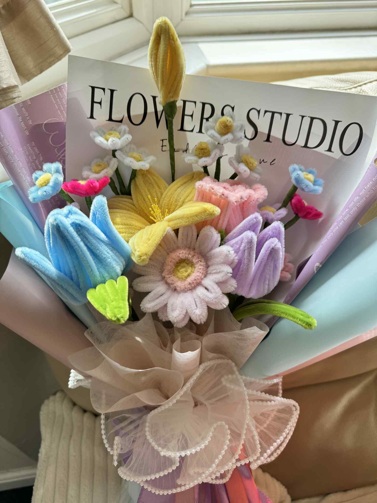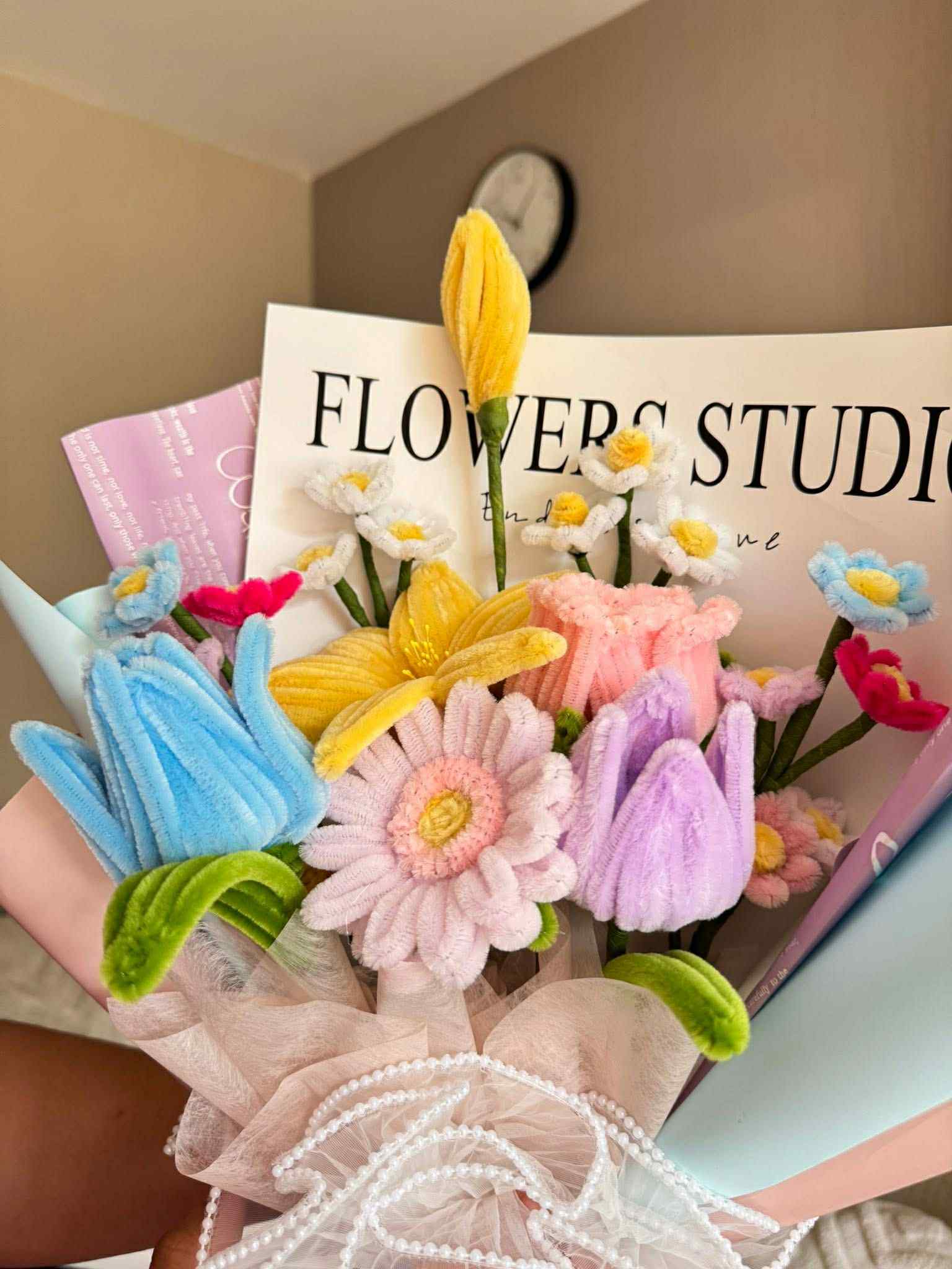 So I searched. And I found WHEN ELLE BLOOMS—a small business here in the UK that handcrafts bouquets out of felt, fabric, and soft velvet-like textures. And it was perfect. Every petal was carefully shaped, every stem placed with intention. The bouquet I chose was a pastel dream of daisies, tulips, and blooms that looked like they stepped out of a watercolor painting. But more than how it looked—it felt like kindness. Like softness preserved.