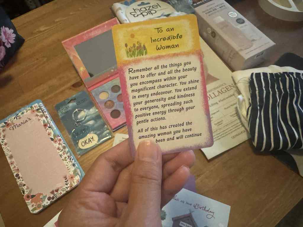 Of course, I adored the gifts too. There’s a keychain from The Fault in Our Stars (Yes, “Okay? Okay.”), a dreamy eyeshadow palette, a silky scarf, facial sheet masks, pastel stationery, and a pouch that’s already holding all my essentials. But what stayed with me the most are the words I read in silence, the ones written just for me.