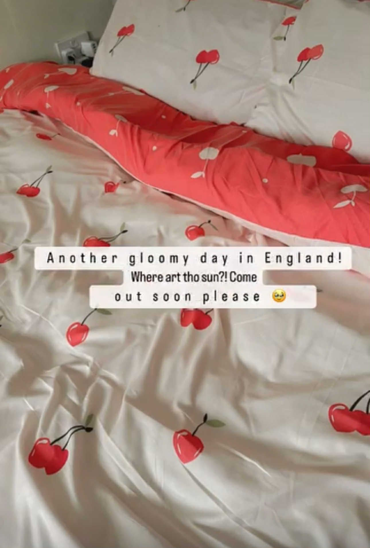 I started slow. The bedroom first. The place where the light filters softly through the curtains in the morning—on good days, anyway. Most mornings in England are wrapped in a familiar grey, like the one I captured in a photo of my cherry-printed duvet. The caption read: “Another gloomy day in England! Where art thou sun?!” But even in the gloom, there’s comfort in a freshly made bed and a blanket that smells like lavender fabric softener. Little things.