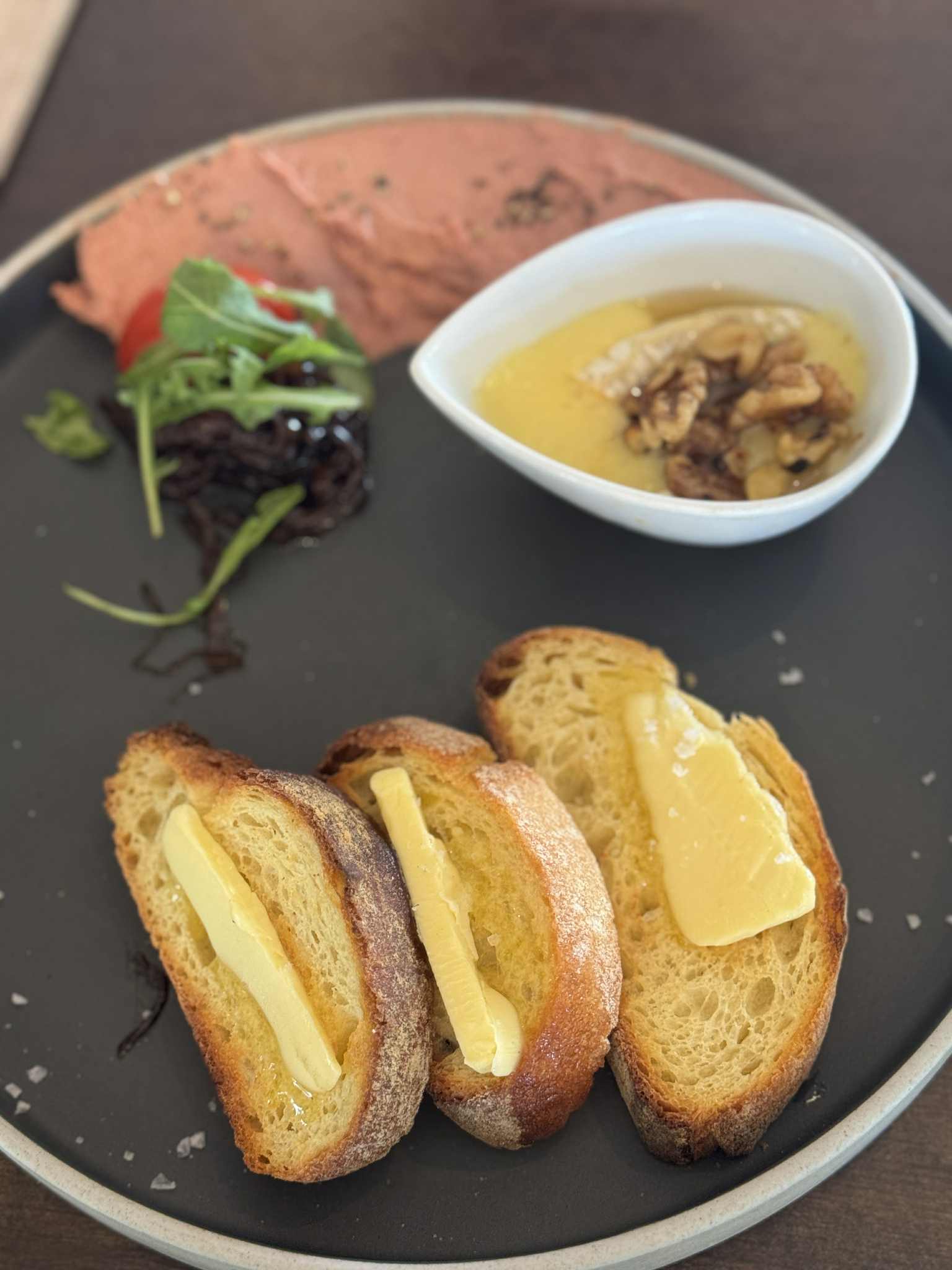 Next came a rustic platter of toasted bread served with thick slivers of butter and a side of pâté and nuts drizzled in golden oil. The bread was crisped to just the right level—enough to hold its shape without cutting the roof of your mouth—and the butter melted into the warm slices like old love letters warming in the sun.