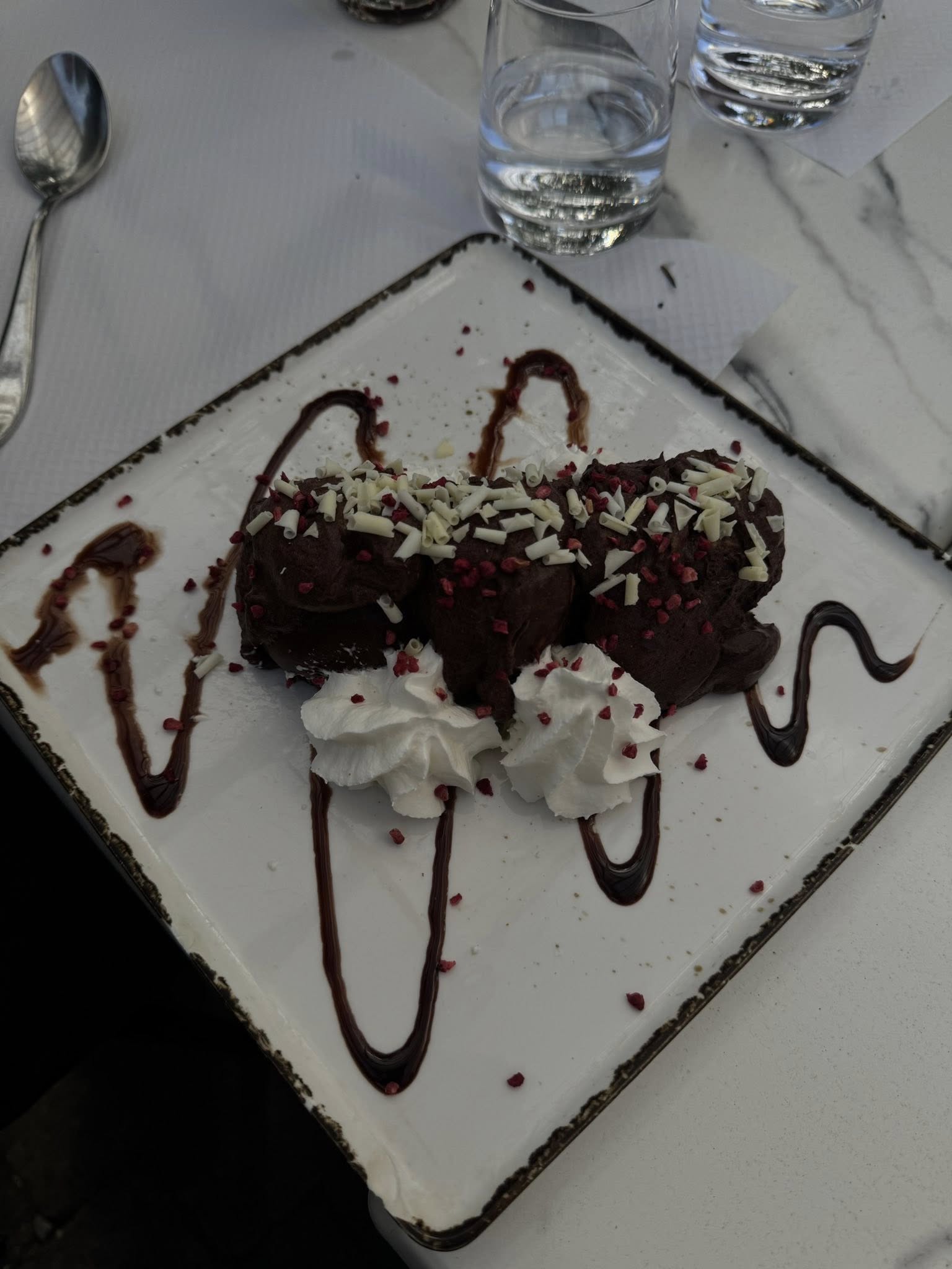 And then there was dessert: a rich scoop of dark chocolate gelato, topped with whipped cream, drizzled with chocolate sauce, and sprinkled with dried raspberries and white chocolate curls. The kind of dessert that doesn’t just finish a meal—it makes it linger in your memory.