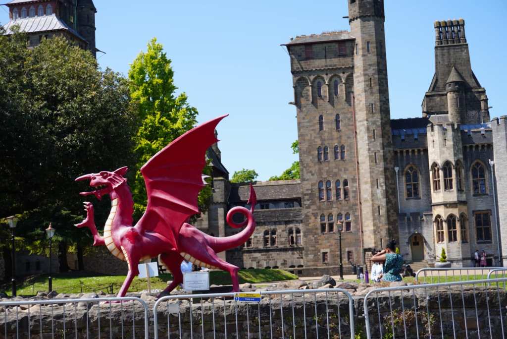 Inside the castle grounds, the details were breathtaking. Gothic towers, stained glass, and carved stonework—all reminders of how much effort people once poured into beauty, even in fortresses. Outside, the Welsh dragon stood proudly in bright red, a bold symbol of strength and resilience.